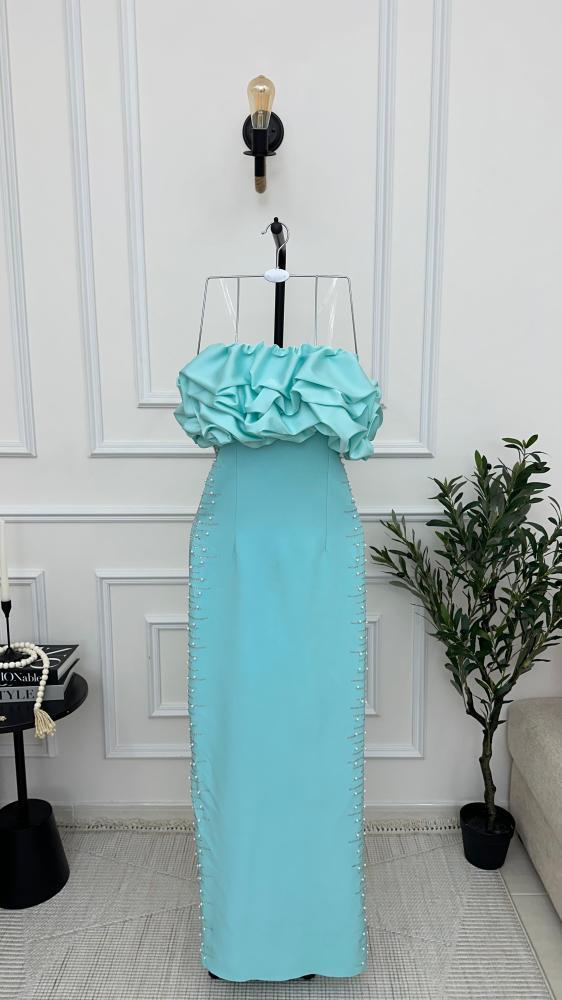 •الجزء السفلي: فستان طويل بقصة مستقيمة تعزز من الطول وتمنح مظهراً فخماً.
