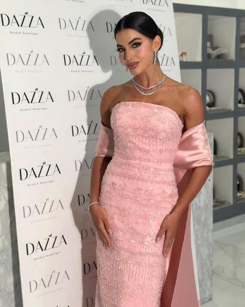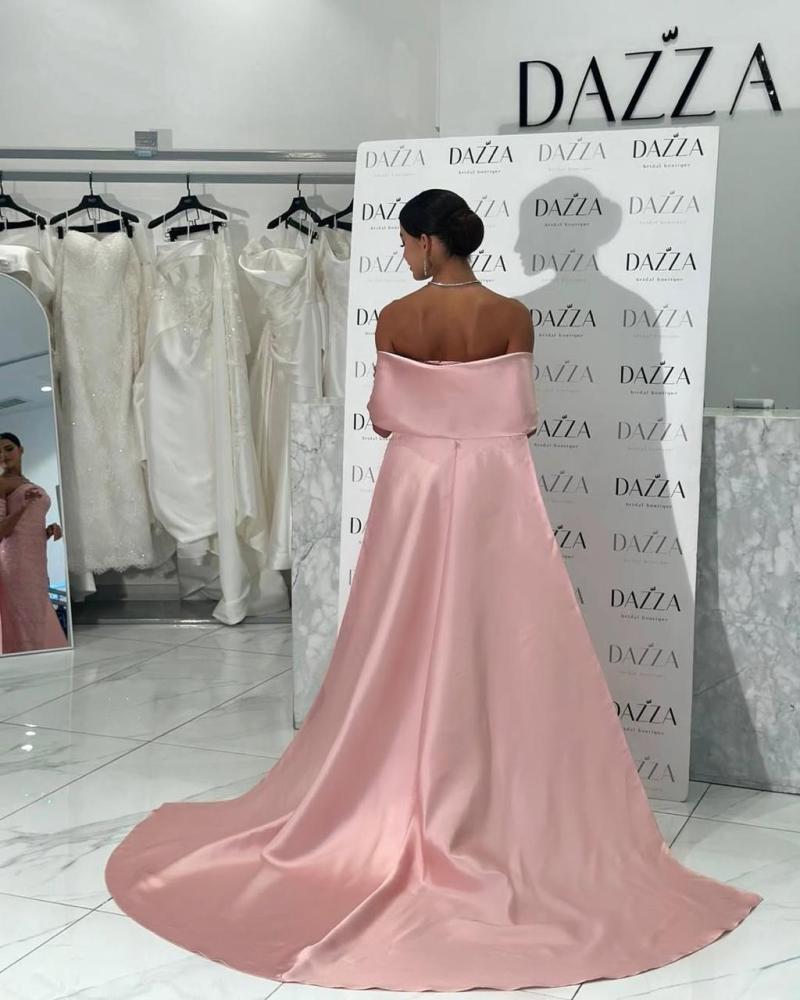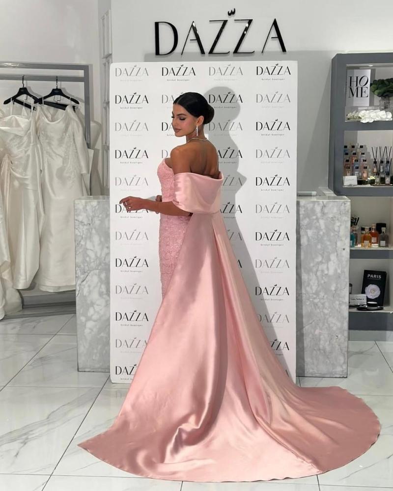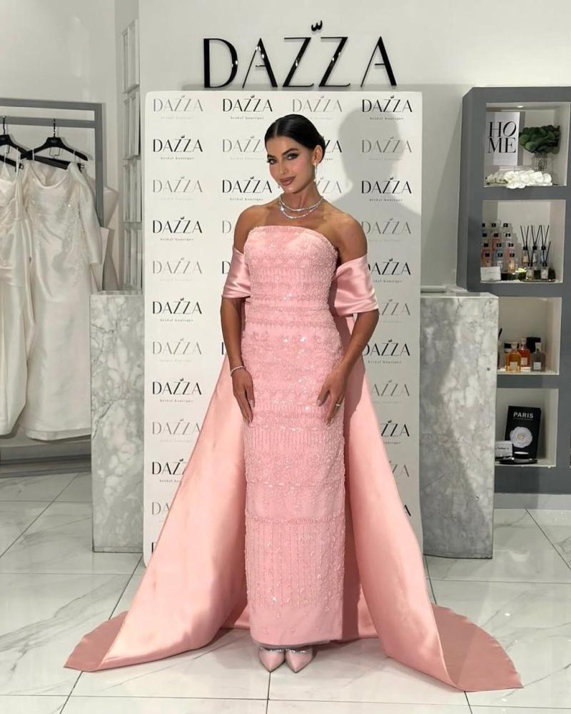 التصميم يتسع من الخلف بذيل طويل (Train) مصنوع من قماش ساتان لامع بنفس اللون الوردي، ما يضيف فخامة للفستان.